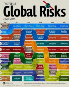 É baseado em uma pesquisa com 3.595 especialistas de 57 países, e traça uma evolução reativa: da pandemia COVID dominando em 2020 à persistência da mudança climática como risco nº1 de 2021 a 2025, com geopolítica e cibersegurança ganhando terreno. Mas essa visualização expõe uma adaptação lenta – por exemplo, a rápida descida da pandemia para 9º lugar ignora vulnerabilidades persistentes, enquanto a entrada da demografia em 10º subestima impactos de longo prazo em um mundo envelhecendo.